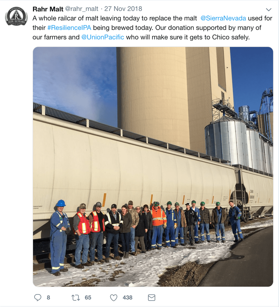 “We were in Germany as the details of the magnitude of the Camp Fire continued to come in. Ian [Ward, President of RahrBSG] and I were together and I remember him grabbing his phone to text Ken Grossman at Sierra to ask how we can help. Ken called back shortly after and we immediately decided to free up as much malt as it would take to support their Resilience IPA concept. I think having been directly impacted by the Napa/Sonoma fires the year prior made it hit home particularly hard.”