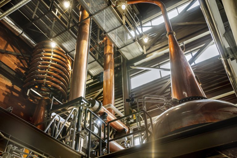 Our Stills, HLT’s, and Mashtun were built by Forsyths Ltd in Scotland. We have two 125-hectoliter wash stills and two 85-hectoliter spirit stills. Our fermenters and cereal cooker were produced by JVNW in Oregon. We have seven 250-hectoliter gallon fermenters.