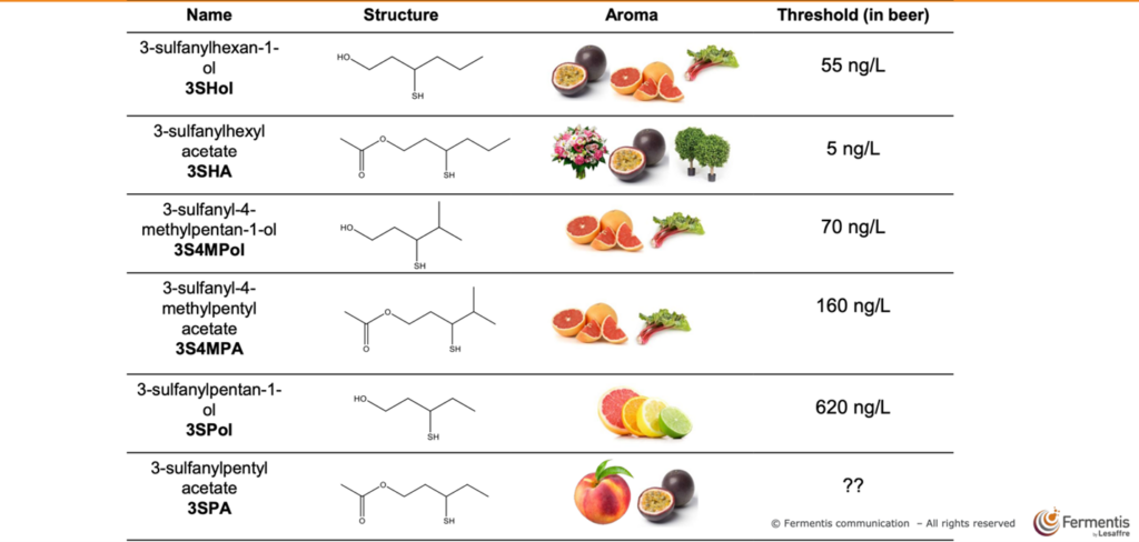 Some key thiols with molecular structure, aroma profiles, and sensory thresholds – image courtesy Fermentis by LeSaffre