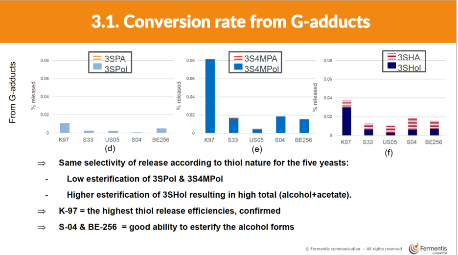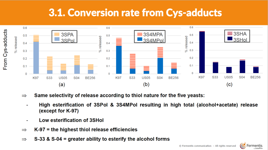 SafAle™ K-97 boasts the highest thiol release efficiencies across the tested strains; S-04, S-33, and BE-256 are strong candidates for achieving biotransformation via esterification.