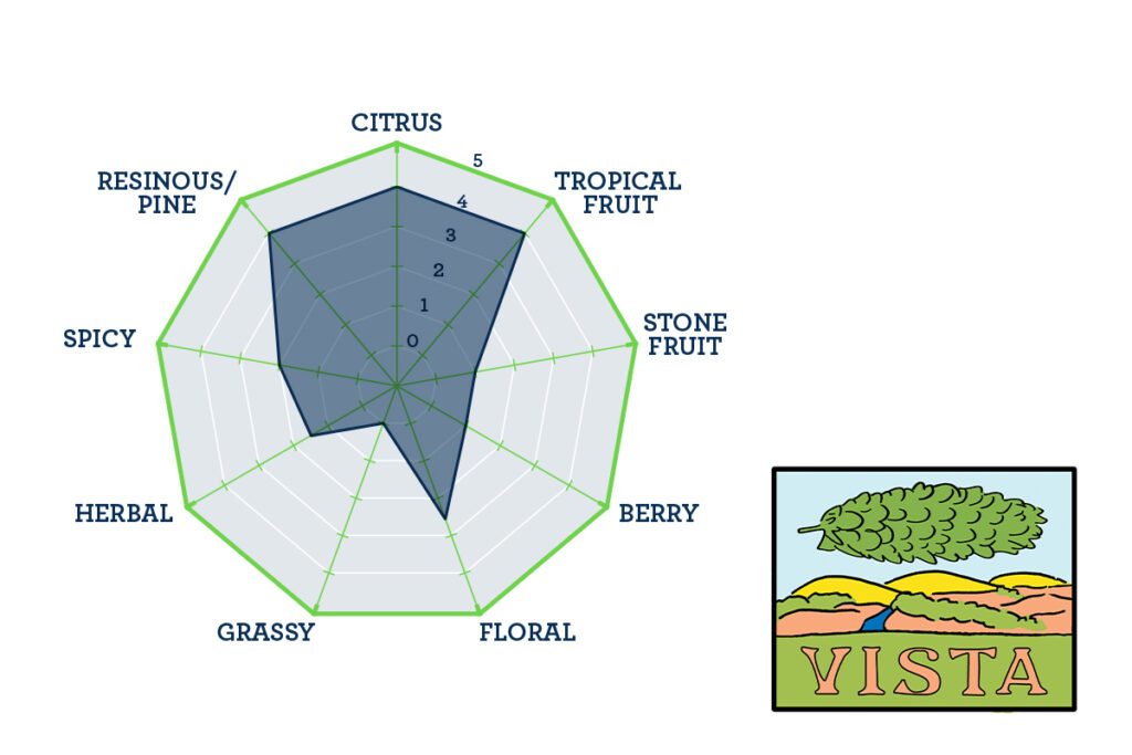 As a soloist, expect Vista to contribute flavors and aromas of honeydew melon, papaya, and tropical fruit backed with white peach and ripe pear. Feedback from brewers who have used it in commercial brewing trials conducted by Hop Research Council has been that Vista “plays well” with other hops.