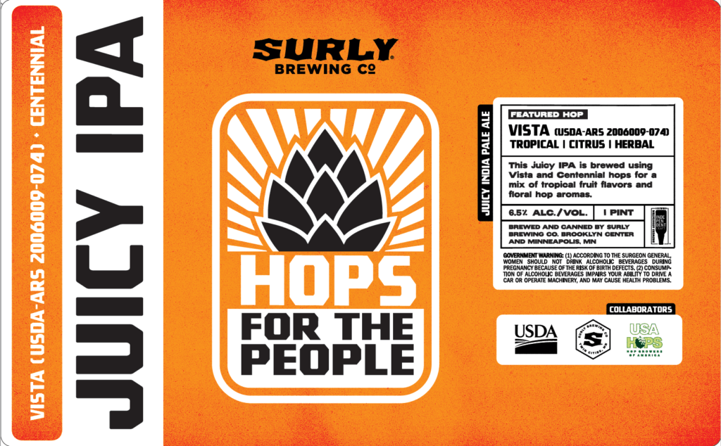 “With base analysis of the pellets, we found melon, tropical and herbal notes and decided to brew a Juicy IPA,” Surly’s Head Brewer Ben Smith told us. “The finished beer had great tropical and stone fruit notes as well as citrus and a slight but pleasant herbal component. We paired Vista with Centennial to feature public hop varietals for the collab, but I’m excited to work with Vista in the future in blends with other hops – I think it’s a great hop on its own but will also add complexity as part of a blend.”